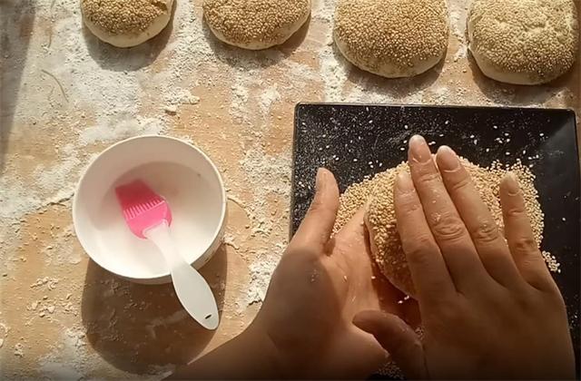 6.我们先把面剂抻长,上下对折,这样能够增加饼的层次,然后再对折,用虎口转动把面皮收口,把面剂整理成圆形之后,两面分别沾上清水,沾上生芝麻,用手轻轻的按压,使芝麻粘的牢靠,拿起面饼轻轻的拍打,抖掉多余的芝麻。