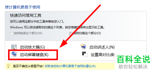 3. 第三步在弹出的窗口中,根据下图箭头所指,点击【启动屏幕键盘】选项。