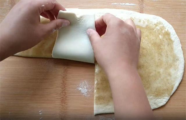 4.这个面皮不要擀的太薄,搅拌一下油酥倒入,这样能够使盐度更加均匀,我们从左边切开一个约面皮总长度4分之1的切口,然后对折,一直重复上一个动作。