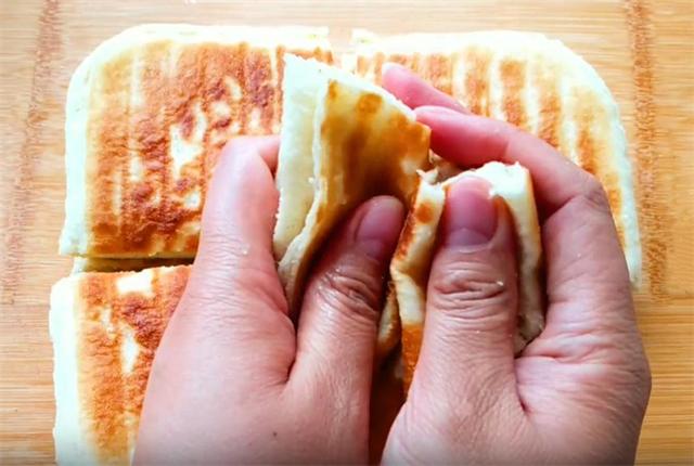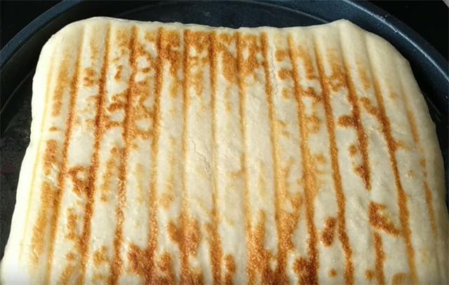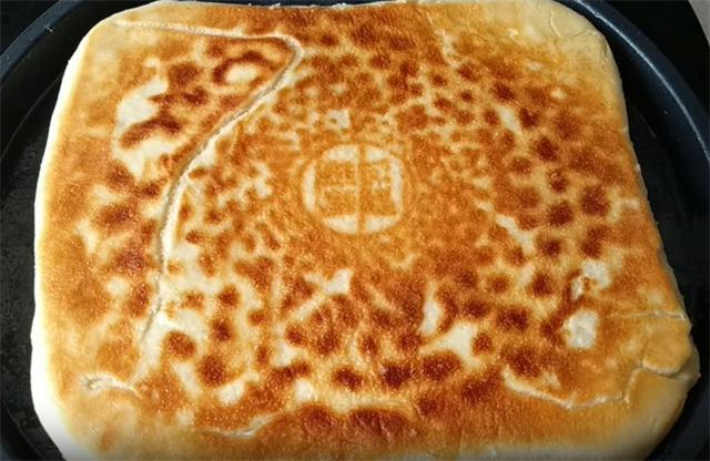 8.开盖,这时饼已经鼓起,说明内部已经基本熟透,我们翻面,盖上盖子再焖一分钟,时间到开盖,我们翻面看一下底面已经成金黄色,用手按压立即回弹即可出锅。