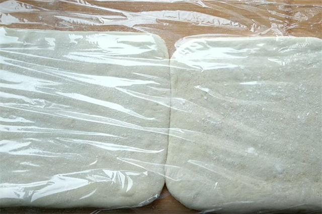 6.把做好的饼坯整理一下,正反面按压,然后再用擀面杖把它擀成1厘米厚见方的饼坯,饼坯上撒上少许干面粉,防止粘连,盖上保鲜膜密封二次,醒发十分钟。