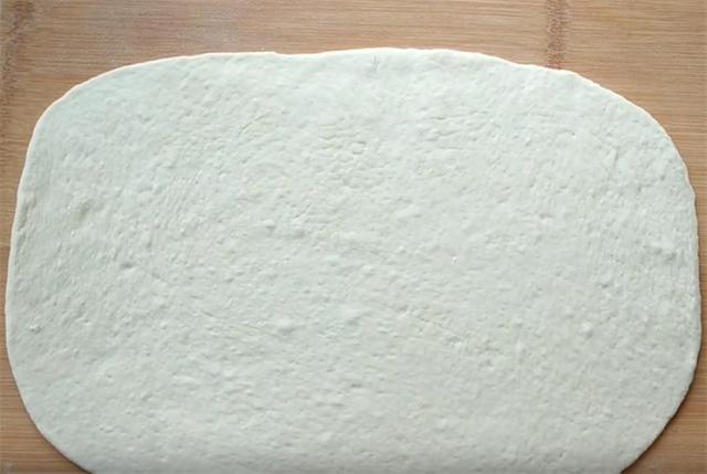 3.案板上撒上一些干面粉,把醒发好的面揉搓排气,把它揉成圆形的面抻长,用手按扁,用擀面杖把它擀成半厘米厚的薄片,再整理成长方形的形状。