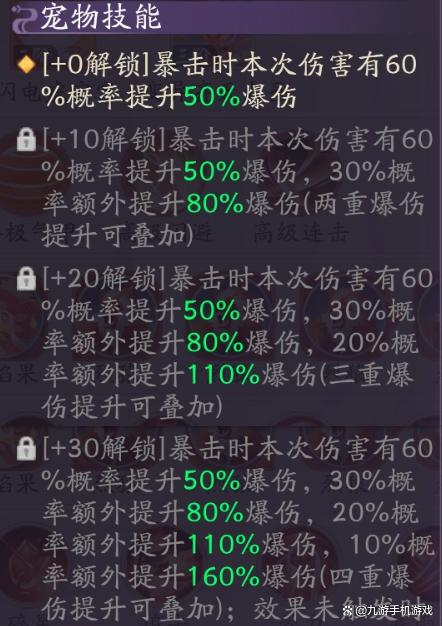 当技能升至 30级后,暴击时本次伤害有60%概率提升50%爆伤,同时30%概率额外提升80%爆伤,20%概率额外提升110%爆伤,10%概率额外提升160%爆伤(四重爆伤提升可叠加)。效果未触发时,下次触发概率增加,最终期望能提升92%的爆伤。