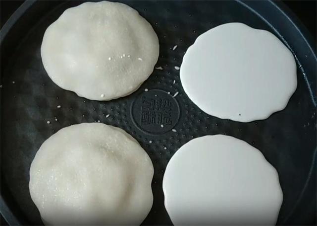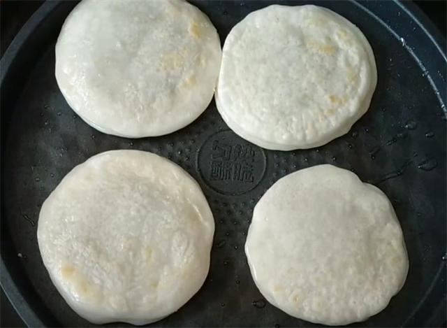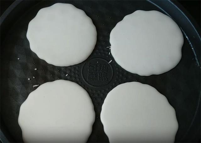 3.这时我们起锅开小火,锅中不用放油,搅拌一下面糊使其更加均匀,保证一勺一个面饼,这样做出的面饼大小一致,烙至面饼变色。
