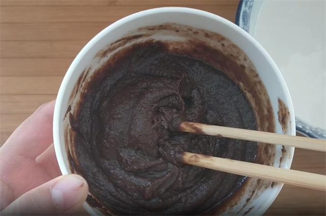 2.准备豆沙馅约50克,这个在超市或者是卖调料的地方都可以买到,用清水把它泄开,搅拌到这种粘稠程度就可以。