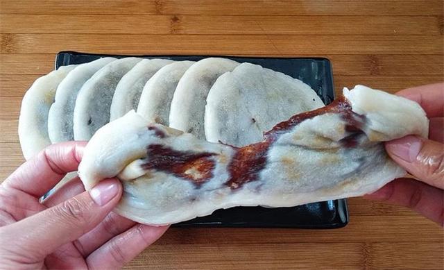 4.然后我们在面饼上放入豆沙馅,用另一个面饼覆盖,按压边缘封口,因为本身这个糯米饼粘性就很大,所以说封口很容易,然后在空出的地方,再倒面糊重复上一个动作,这样做节约时间。