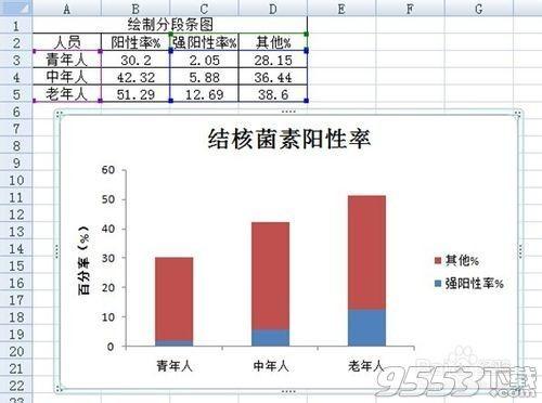 发现没有,这里是采用Excel 2007中的柱形图来绘制分段条图。