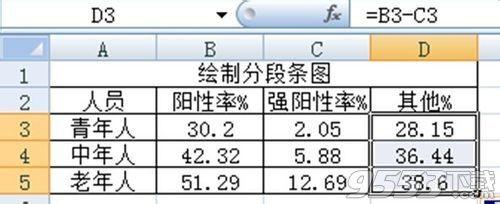 2、单击单元格D2,在其中输入“其他%”,合并单元格A1:D1。然后单击D2,在编辑栏中输入公式“=B3-C3”,按回车键结束,然后再单击D2,拖动鼠标利用Excel自动填充功能求出C3:C5各单元格值。其他情况的百分率计算结果如图。