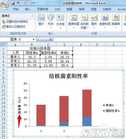强阳性率为阳性率的一部分,因此可以将阳性率分解为强阳性率与其它两个组成部分,整个直条代表阳性率,所以该数据资料宜绘制分段条图来分析。