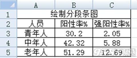 1、新建工作表“分段条图的绘制.xlsx”,输入数据,表头为“绘制分段条图”。