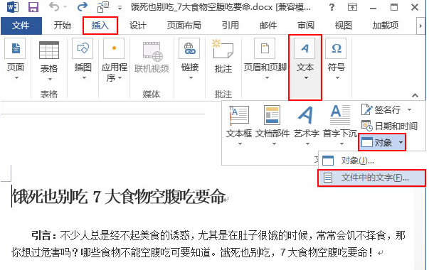 通常编辑文档或者查看文档都会使用Word打开。在Word使用过程中,小编发现了一个很好用的功能,可以将多个文档合并在一起,而且被合并的文档并不会就此删除。 1.用Word2013打开其中一篇文档,选中其它文档插入的位置,然后切换到“插入”选项卡,单击“文本”组中“对象”里的“文件中的文字…”选项。