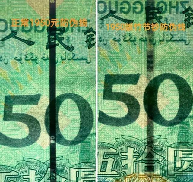 上面的照片,是正常50元和竹节钞的对比。 可以看到右侧竹节钞的防伪线出现明显的断续,并且线上并与“50”的面值数字。这就是竹节钞的典型特征。 这种特征在19版纸币的大面值,以及冬奥钞和70钞中都有发现,且均有PMG认定的竹节钞版别。