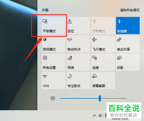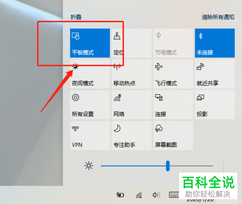 2. 第二步,来到下图所示的操作中心窗口后,点击箭头所指的平板模式选项。