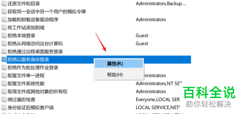 7. 第七步在右侧窗口中,鼠标右键单击【拒绝以服务身份登录】选项,根据下图箭头所指,点击【属性】。