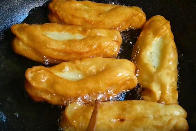 5.这时我们起锅开小火,多放一点油,油温6到7成热,然后轻轻的低一点,下入油条,防止油溅烫伤,下锅以后不要翻动,如果翻动的话会影响油条的蓬松,炸至底面金黄再翻面,炸至两面都成金黄色即可出锅,喜欢吃酥脆的口感,就每面多炸制一会儿就可以了。