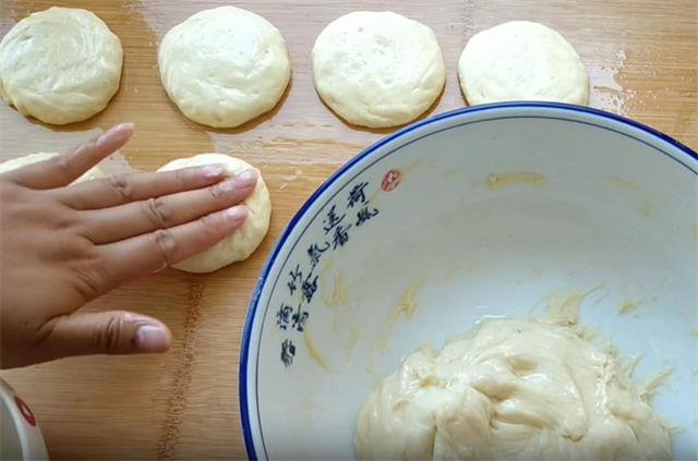 2.接下来我们在案板上和手上抹一些油,把发好的面搅动几下排气,把面团像这样用虎口掐断,揪成小剂子搓圆,300克面粉大约下十个面剂左右,每个面剂约50克。