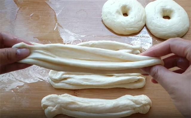 4.醒发至面剂鼓起,拿起面剂把它抻长,然后对折捏合底部做成油条的形状,这个时候的面是非常的软,而且延展性也非常的好。
