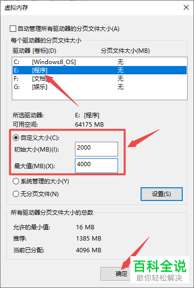 7. 在弹出的虚拟内存窗口中,将内存不足的磁盘选中,点选上自定义大小的选项,在下方输入较大的内存范围,建议是我们实际磁盘范围的2倍,最后,点击底部的确定按钮即可解决。