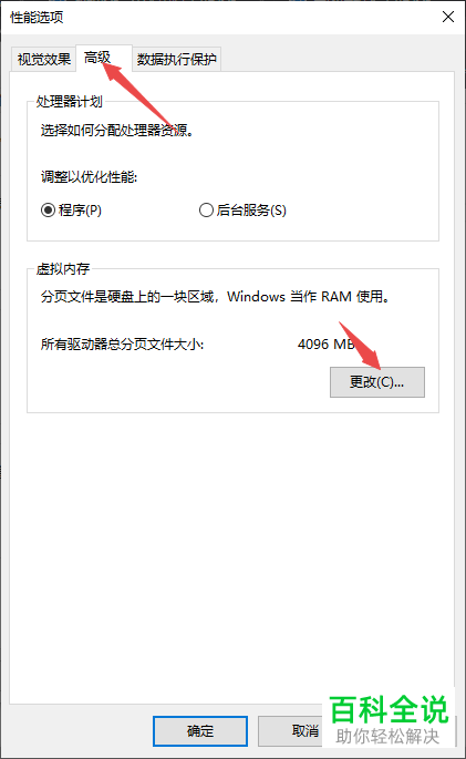 6.在弹出的性能选项窗口中,上方切换到高级选项下,点击右下方的更改按钮;