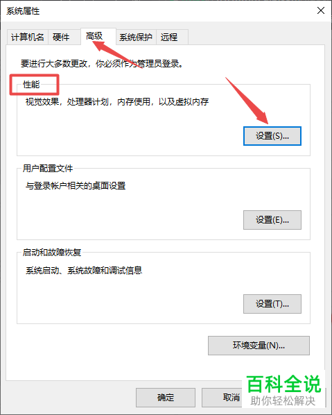 5. 在弹出的系统属性窗口中,上方切换到高级选项下,然后在性能下,点击右侧的设置按钮;