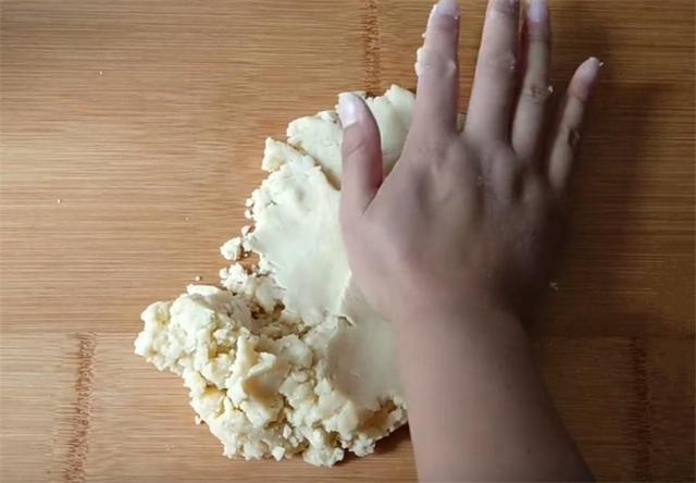 2.接下来我们来制作油酥,面粉150克,油75毫升,搅拌均匀之后放在案板上,用手掌把它搓的更细腻,这样更容易擀开,然后把油酥团圆备用。