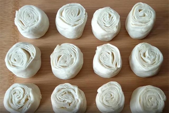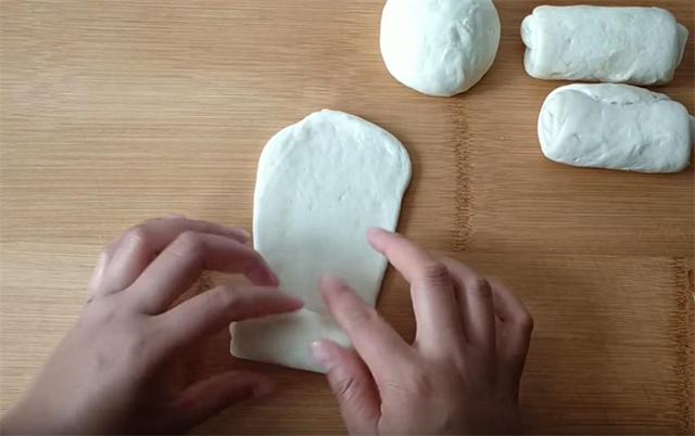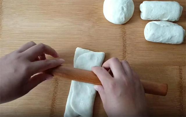 9.折叠之后旋转过来,再次上下各擀一杖,不要回头擀,这样油酥容易擀漏,然后卷起,饼的生坯就做好了。