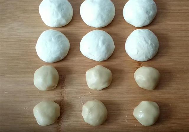 6.再用面皮搓好之后,再把油酥搓成长条,然后下和面皮相同数量的面剂,把面剂搓圆备用。