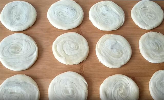12.然后我们先用手把正面按压一下,保持纹理不变,然后再用擀面杖正反面擀均匀,擀好的饼要二次醒发10到15分钟左右,醒发至微微鼓起即可,这样饼才能蓬松酥脆。