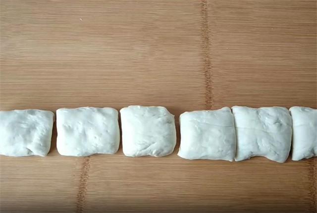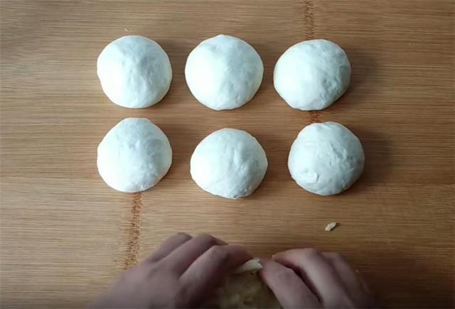4.大家可以看到这个时候的面团是微微的发酵,我们把它稍微揉搓一下排气,下成六个比较大的面剂。