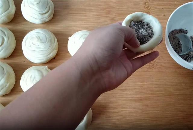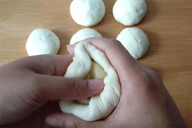 11.接下来我们像这样把它底部旋转着,捏开一个洞,然后包入馅料,用包包子的方法收口,用虎口旋转把封口捏的更紧实,防止烙制时糖馅露出,这种方法能够保持纹理不变。