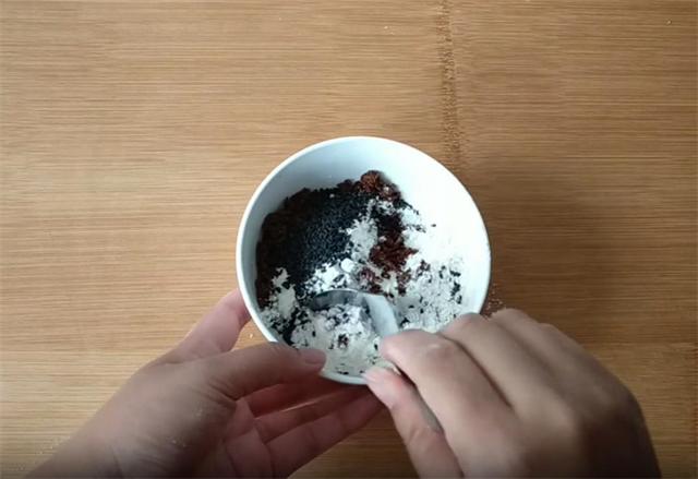 3.接下来制作红糖馅,红糖60克,面粉20克,黑芝麻两勺,搅拌均匀备用,面粉不要放的太多。