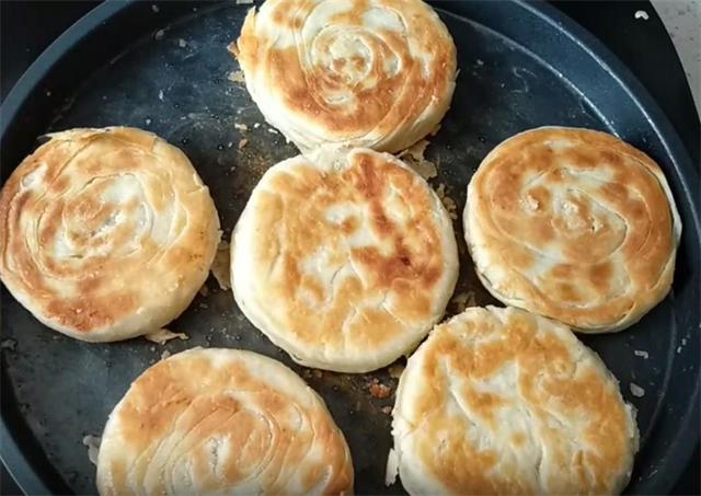 13.接下来我们起锅开小火,放少许的油即可,本身这个饼就含有油分,油温四成热,饼坯正面朝下下入,烙至饼微微鼓起,底面微黄翻面,翻过来之后大约再烙半分钟左右,烙至微黄再次翻面,烙这个饼要小火慢烙4到5分钟,反复翻面直至表皮酥脆即可出锅。