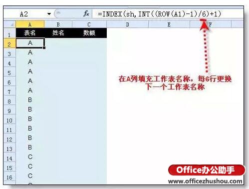 =INDEX(sh,INT((ROW(A1)-1)/6) 1) 公式说明: 此公式目的是在A列自动填充工作表名称,并每隔N行更换填充下一个名称。公式中6是各表格的现在或将来更新后最大行数,尽量设置的大一些。以免将来增加行汇总表无法更新数据。sh是第1步添加的名称。