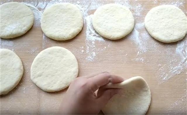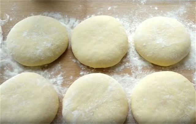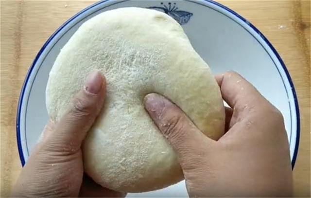 4.把揉好的面剂先用手按扁,再用擀面杖把它擀薄,大约1厘米的厚度即可。