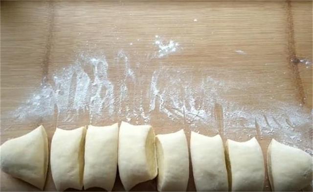 2.接下来我们在案板上放一些干面粉,把醒发好的面团揉搓排气,一定要多揉一会儿,排净空气,这样我们二次醒发的时候毛孔会更加细腻,搓成长条形,下八个面剂左右。