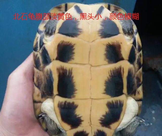 腹部不同:北石龟腹部淡黄色,黑头小,颜色模糊,而小青龟是黄色、黑色斑点更小、模糊且不规则。