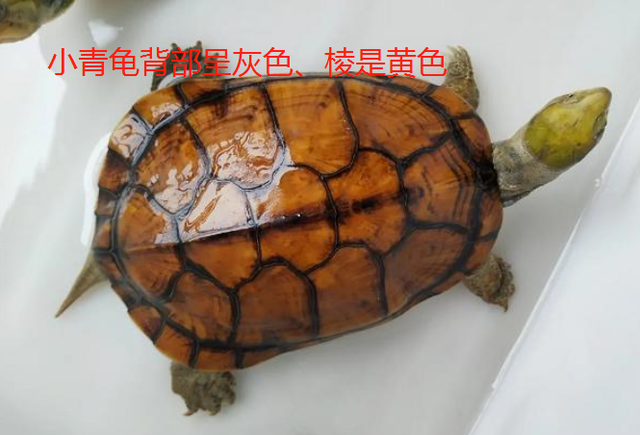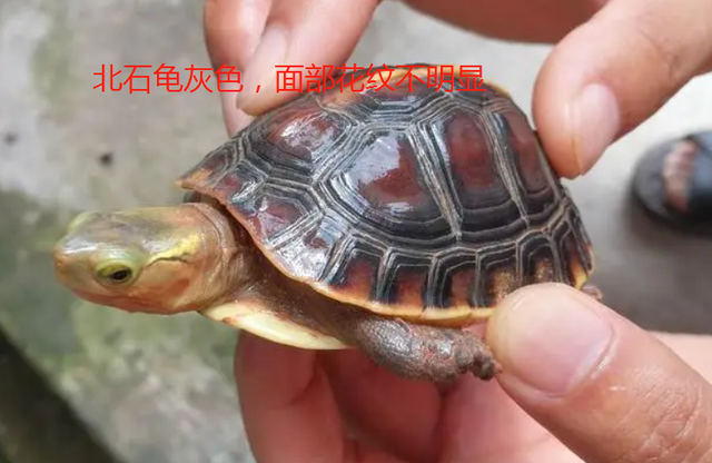 背甲不同:北石龟背甲为灰色黑色,无明显黑棱,而小青龟背部呈灰色、棱是黄色。