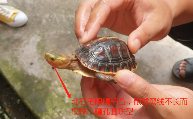眼睛不同:北石龟眼睛稍凸,眼球黑线不长而模糊,瞳孔圆珠型,而小青龟的眼睛突出,眼球没有黑线。