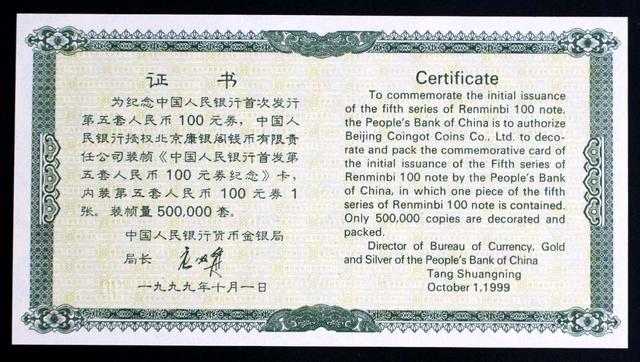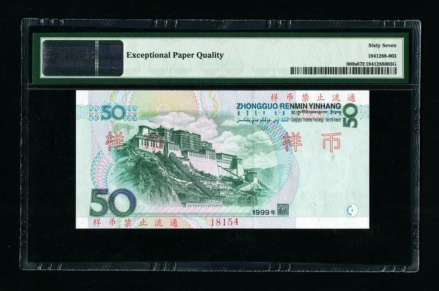 如果我们把条件放宽到所有公开发行的五版币,那么100元首发币是排首位的。 条件再放宽到我们熟悉的五版币版式,那么工作币就成为了币王。 而把所有五版币的设计版本和早期试印样张算上的话,各种试印票就更为出色了。 后面3种五版币,都是能拍到好几万的。1999年的50元,整刀的也能上万。那么,你家能找到哪一种呢? |