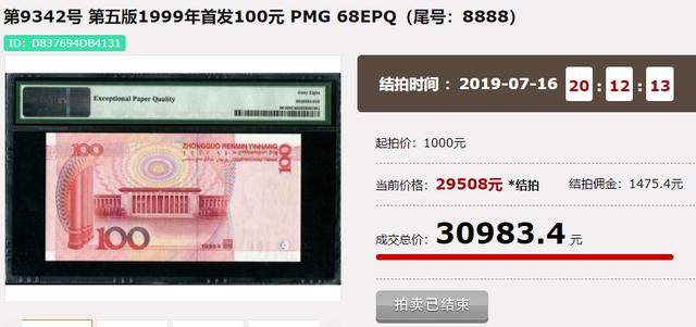 比如上面这张1999年的工作币,PMG仅64分,就能拍出3.4万多。 而67分的100元、50元工作币,都曾有4万以上的拍卖纪录。