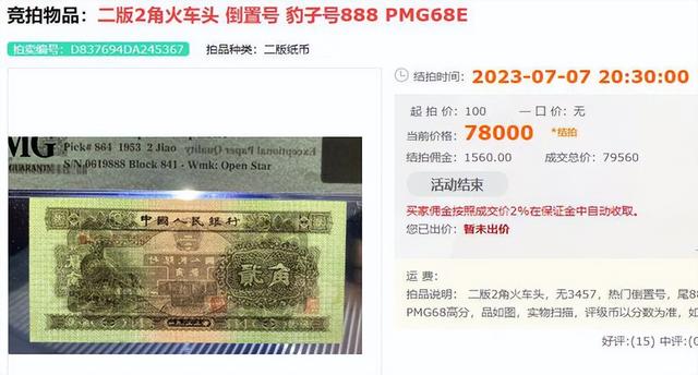 在7月上的拍卖会中,有一张火车头2角纸币拍出了79560,这种2角纸币不知道你家里是否还能找到,火车头2角纸币就是1953年的2角纸币,这种老纸币是二版币中的一员,它在1971年就只收不付了。 所以它在家中还是比较难找到的,它自然也拥有了非常高的市价,从目前的表现来看,一张全新的火车头的2角纸币,市价已经是可以超过2000了,而如果是已经比较旧的纸币,比如图片中这种品相的,币商的报价也达到了980。