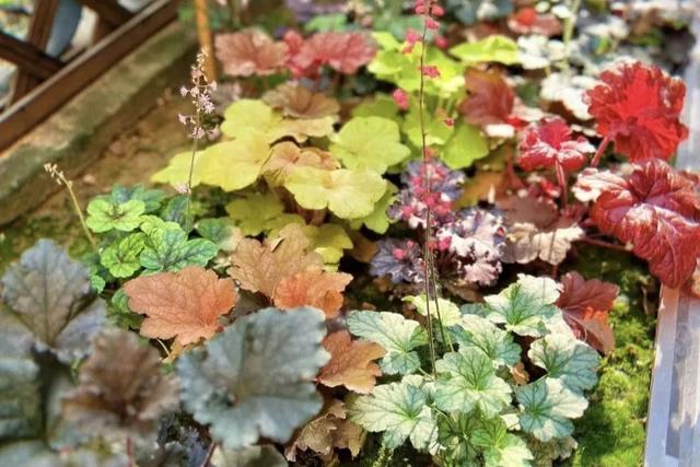 矾根是比较受欢迎的彩叶植物,有多种漂亮的叶色,叶形也十分的优美,平时可单独培养,也可以作为拼盆植物,都极具观赏性。矾根以观叶为主,其开花虽然也好看,是很好的点缀,但还是建议大家开花后将其剪掉,这是因为开花后也会消耗掉大量养分,叶子生长状态会变差。