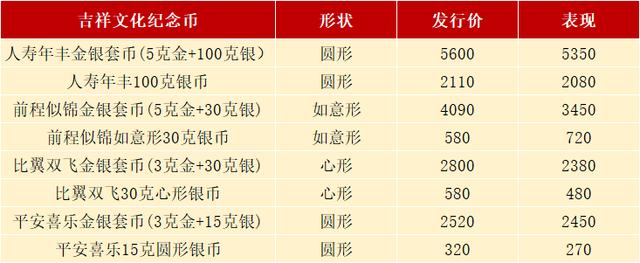 第一套是2023年吉祥文化纪念币。这是一个从2015年就开始每年发行的大系列,一共包含4个主题。 其中心形的520纪念币,更是历年金银币中的最大热门之一。 只是,它在开始预约没多久后,就有部分规格提前迎来破发。 如今的表现,百科网也给大家进行了简单的整理。