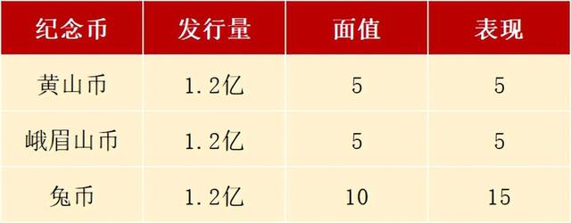 如今,这套纪念币在金总的抽签预约结果已经出炉,还有部分入口可以预约,但百科网个人是不建议大家去参与了。 3枚普通纪念币除了3套金银币外,我国今年还发行了3枚普通纪念币,它们依次是兔币、黄山币和峨眉山币。后两枚是一起预约的。 百科网也给大家整理了它们的表现。