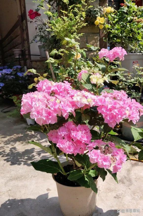 盛开状态下的绣球花,选择阴养的方式是最合适的,不用晒太阳,反而开放的花期会更长一些,这是养殖绣球花的常识。 没有太阳直射光下的绣球花也需要进行正常的浇水的,绣球花的叶片数量非常多,在夏天受高温影响,水分的散发速度很快,根系吸收大量的水分,通过叶片就会散发掉,这个时候如果一旦断了水,绣球花的叶片很快就会软掉,盛开的花瓣很快也就会凋谢。