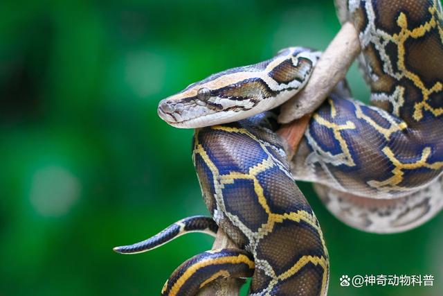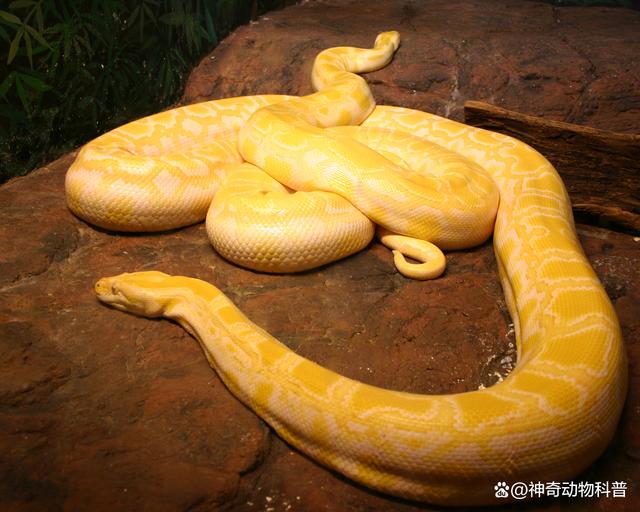 非洲岩蟒是蛇亚目蟒科蟒属下的一种无毒蟒蛇,主要分布于非洲南部撒哈拉地区,是非洲体型最巨大的蛇类。成年的非洲岩蟒体长可达6米,是全球最巨型的蛇类之一(其它巨蛇亦是同属蟒属下的蛇类)[3]目前为止,有纪录最长的非洲岩蟒是于1932年于科特迪瓦所发现的,其体长达9.72米。非洲岩蟒的体色主要由棕色构成,身体上有许多橄榄色的不规则图纹。其体纹与颜色均与缅甸蟒十分相似,因此容易被混淆。然而这两种蟒蛇并没有紧密的关联。 6、黄金蟒(学名:Python bivittatus)