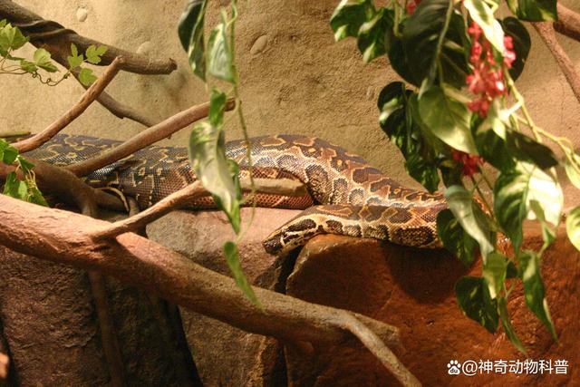 紫晶蟒亦称冠丛莫瑞蟒、水晶蟒、澳洲灌木蟒或简单只叫灌木蟒,是蛇亚目蟒科树蟒属下的一个无毒蛇种,主要分布于大洋洲的印尼、巴布亚新畿内亚及澳洲东北部。紫晶蟒是相当著名的爬虫类动物,它是澳洲当地体型最巨大的蛇类,也是世界上最巨型的数种蛇类之一。目前尚未有任何亚种被确认。目前所知最巨大的紫晶蟒可以拥有超过8.5米的长度,但事实上这种长度的紫晶蟒并不常见,在当地一条长5.5米的紫晶蟒,已可视为巨型蟒蛇。体色多呈棕色,或以橄榄色及暗黄色为基调。眼睛较大,头部有大片鳞片,吻部有热能感应颊窝。与其它蟒蛇相比,紫晶蟒的躯体显得较纤幼。其学名中的“紫水晶”(amethistina),是比喻其于光线下闪耀生辉的乳白色鳞片。 5、非洲岩蟒(学名:Python sebae)