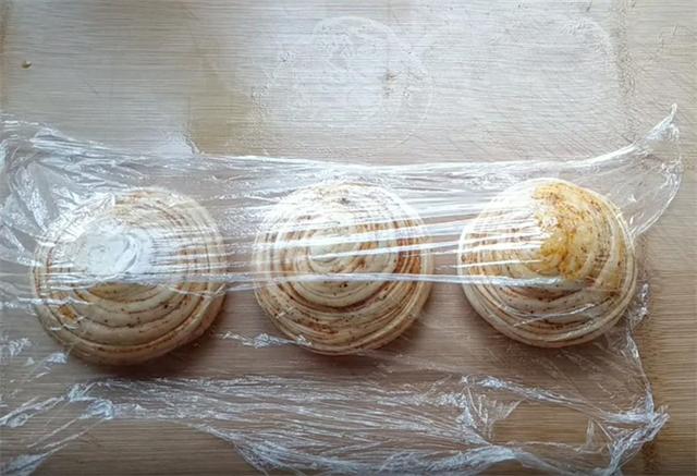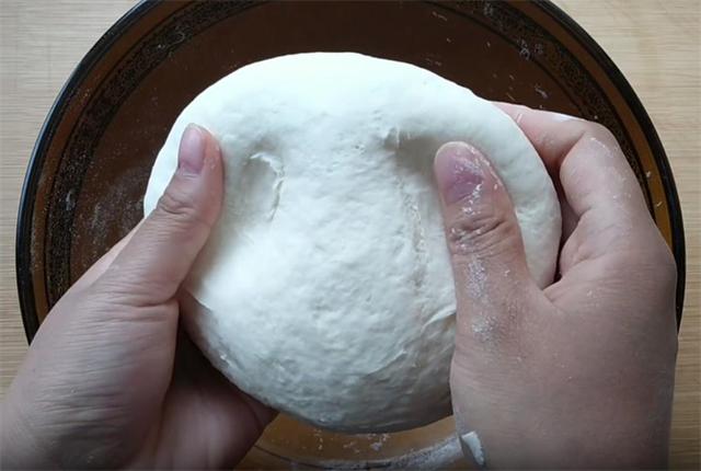 7.最后收尾的时候,我们把尾部按扁,压在饼坯底部,按压一下即可,做好的饼坯再松弛十分钟,这样口感更加柔软,而且更容易擀开。