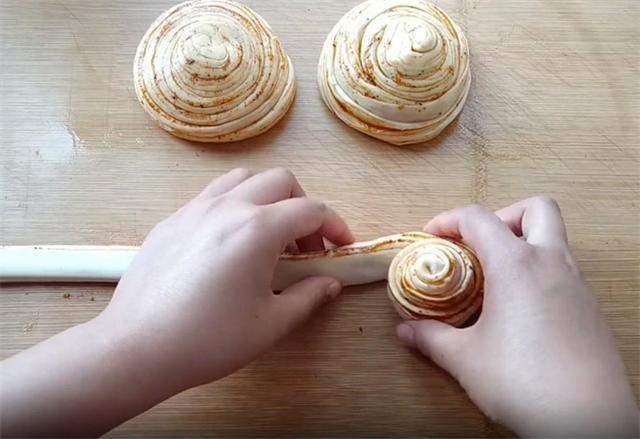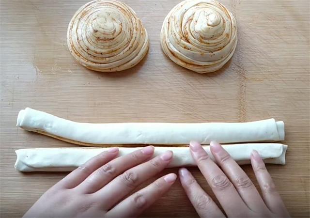 6.把切开的两半摞在一起,用手整理一下,使切面对齐,然后我们把它按扁,再次抻长按薄,我们从一边边拉伸边卷起,这样能够增加它的层次感。