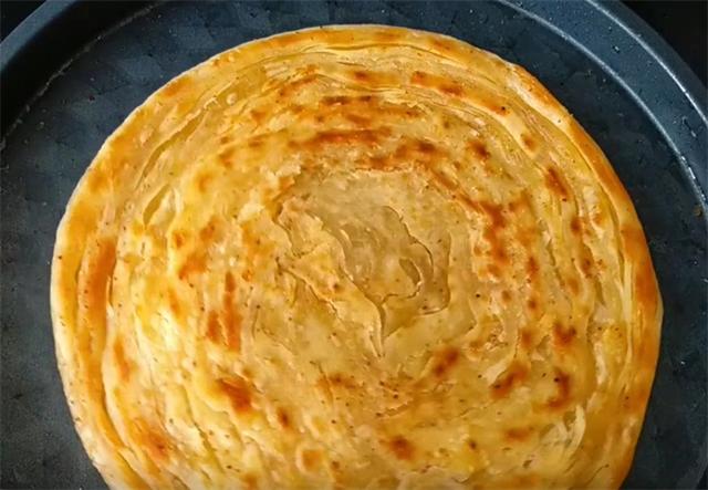 9.这时我们起锅,电饼铛要开大火,油温六成热,下入饼坯,把它整理一下,使其更加圆润,烙至饼鼓起,我们翻面,盖上盖子焖一分钟,使其内部熟透。时间到,我们开盖翻面,大约再烙制一分钟左右,烙至底面金黄,我们再次翻面,烙至两面金黄酥脆出锅。